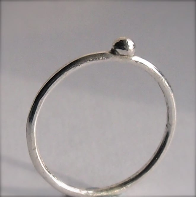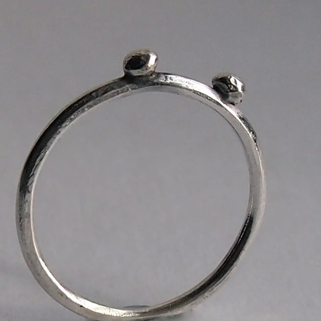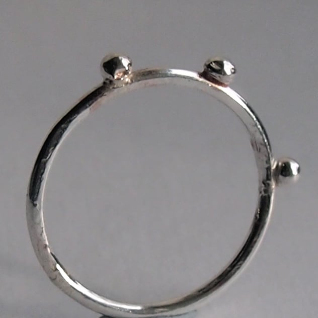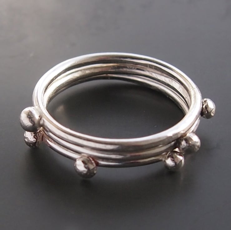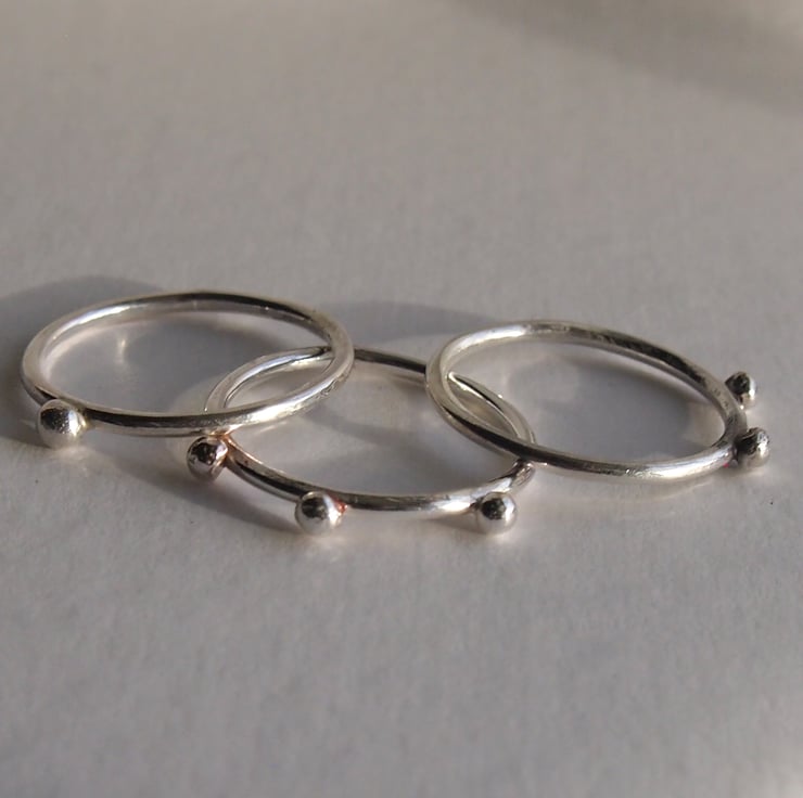Three sterling silver 1.5mm bands with one dot of silver soldered on to one, two dots on the other and three dots on the third. Wonderful on their own or great to stack.