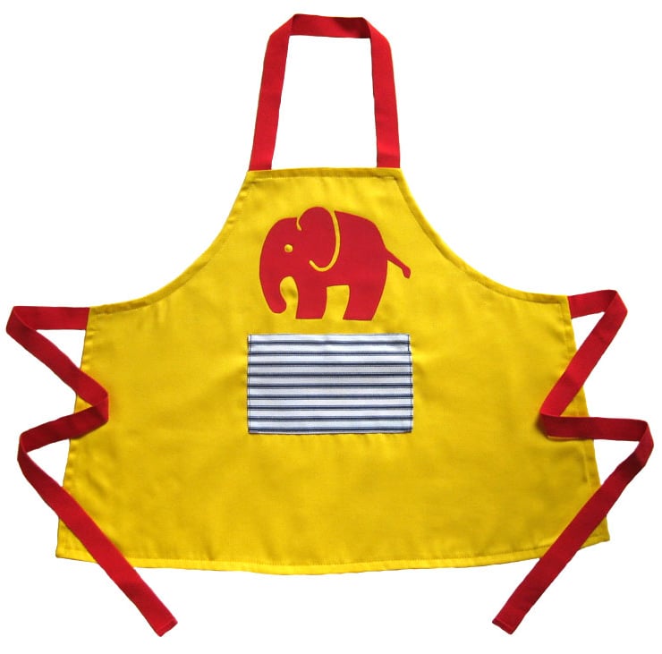 Bright yellow soft poly/cotton apron, red cotton jersey 'Efalant' applique, 'ticking' fabric pocket and bright red (acrylic or polyester) woven webbing ties.