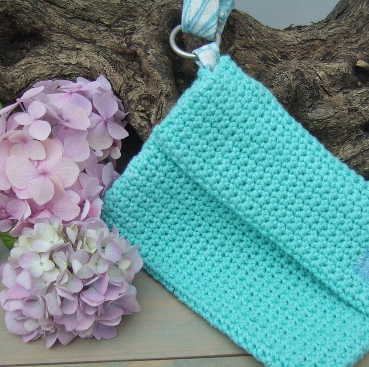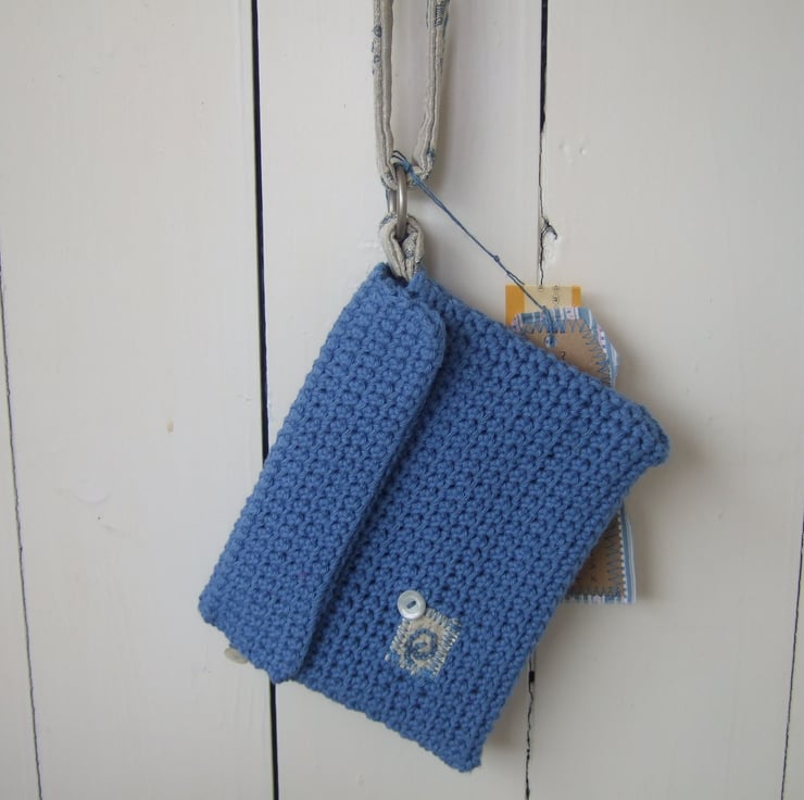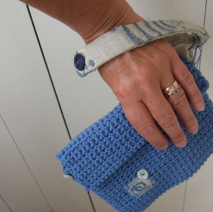 Handmade crochet small clutch bag with wriststrap and pearly button embellishment. This beautiful bag is my own design and handmade from natural materials; cotton yarn and silk fabric.