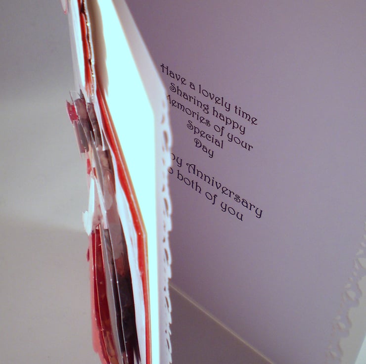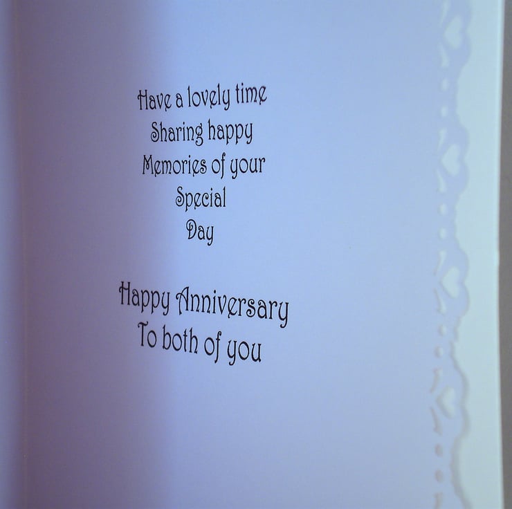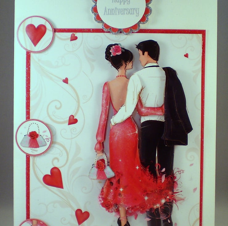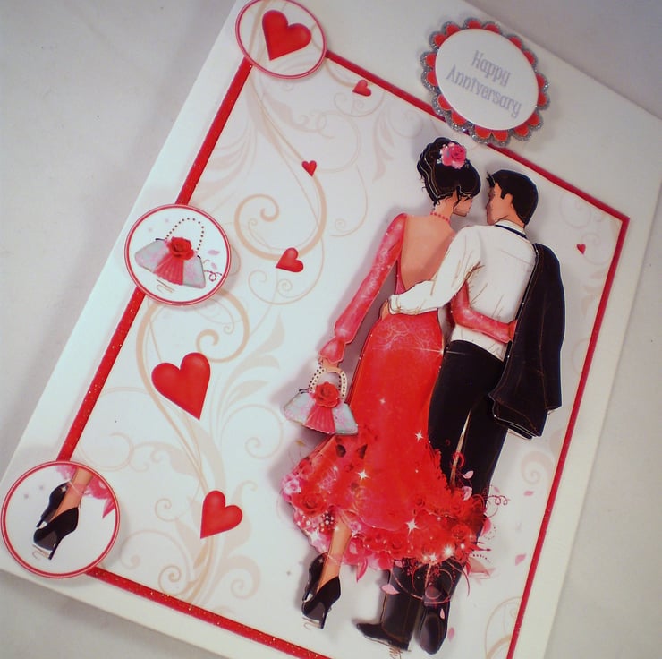 A white linen card measuring approximately 150x210mm (6x8in) features an elegant couple beautifully dressed. The image is 3D/decoupage . Insert is white with a decorative border and there is a greeting. This card could be adapted for any anniversary and can be personalised, just let me know at checkout or send me an email