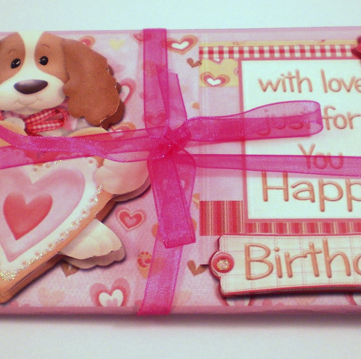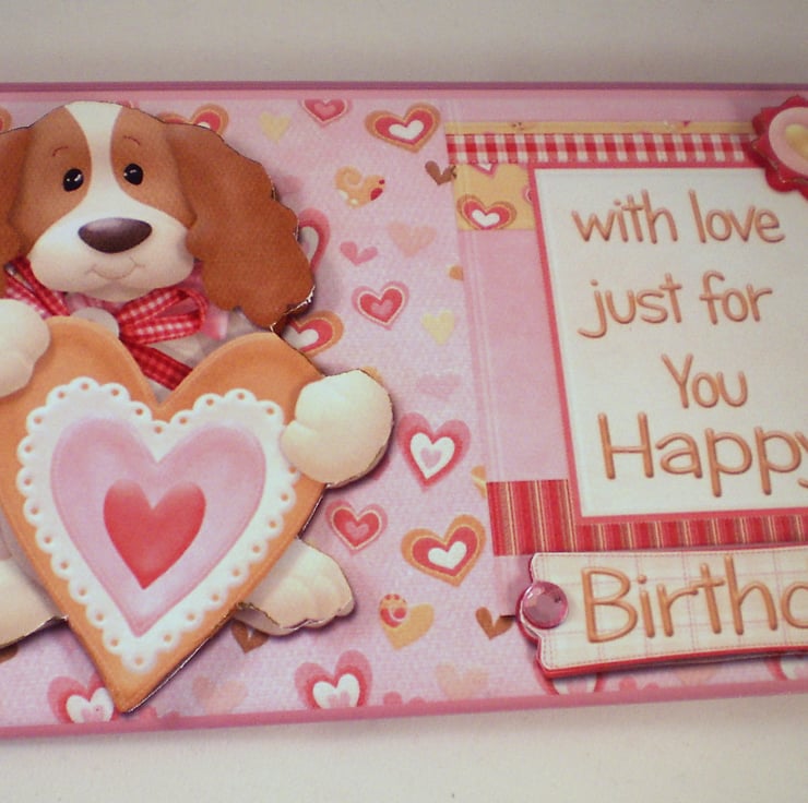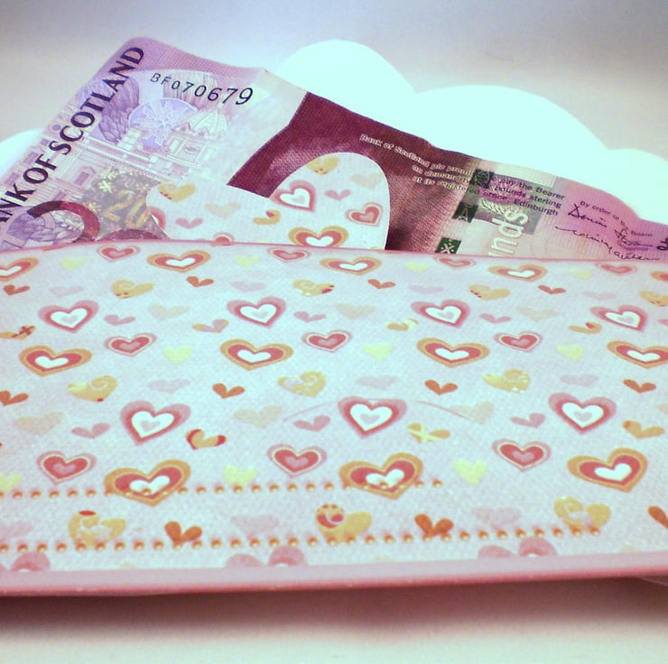 A gift card or money wallet made with quality card in an envelope style measuring 155x95mm(6.5x3.5in).This would suit a female and is a pretty way of giving money or gift card. There is a space at back to write on or you could write on the back of the diecut love heart that is inside the envelope