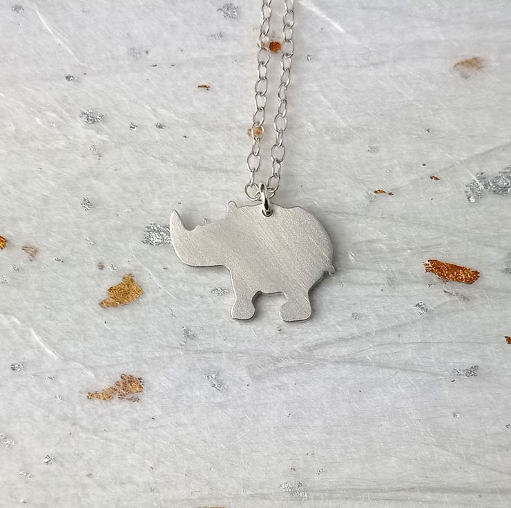 I have made this rhino necklace by cutting recycled sterling silver by hand. After filing and finishing, it was attached to a sterling silver chain. It is part of a collection of animal jewellery, which includes matching rhino earrings amongst other safari and domestic animals.