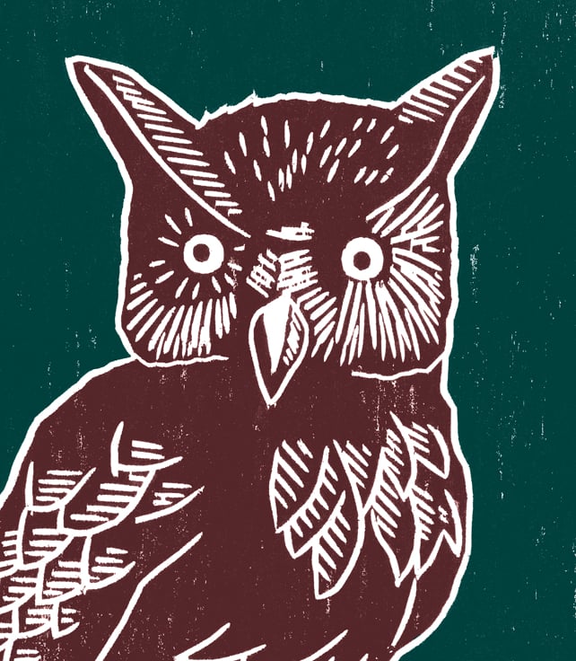 A3 (29.7cm x 42 cm) poster-print entitled 'Long-eared Owl' printed in maroon and dark green.