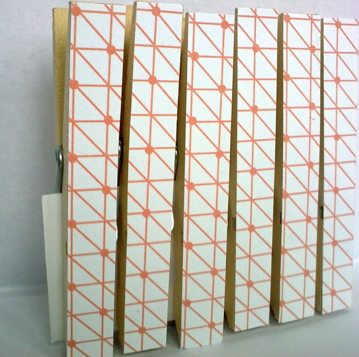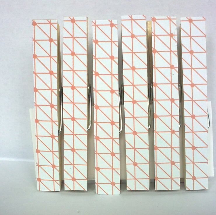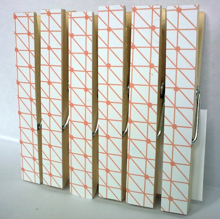 Decoupaged with a range of scrapbook paper called 'Happy Days' with a retro yet modern theme, these sets of 6 pegs are just the thing to add a touch of style to your fridge and organise your lists, letters, coupons and reminders. Also make a great gift!. Exact pattern placement may vary slightly between sets.