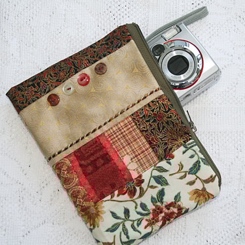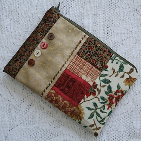 Patchwork, formed from fabrics in shades of red, gold and cream, has been used as the basis for this purse. The added embellishments, ribbons and buttons, have all been chosen in coordinating colours. The purse is lined in a burgundy and red cotton fabric and closes with a zip.