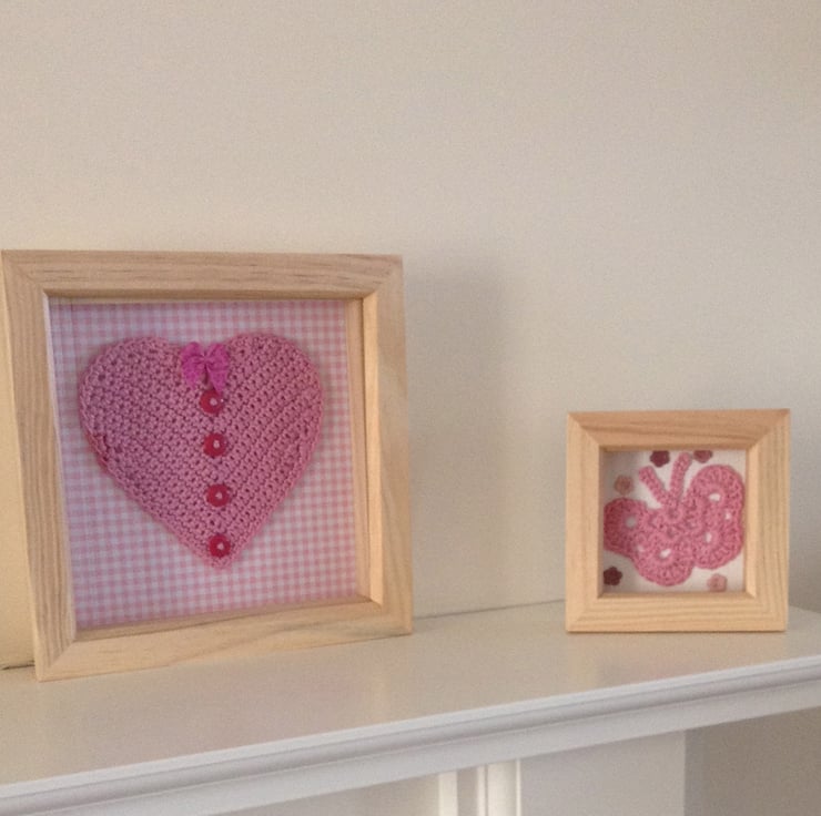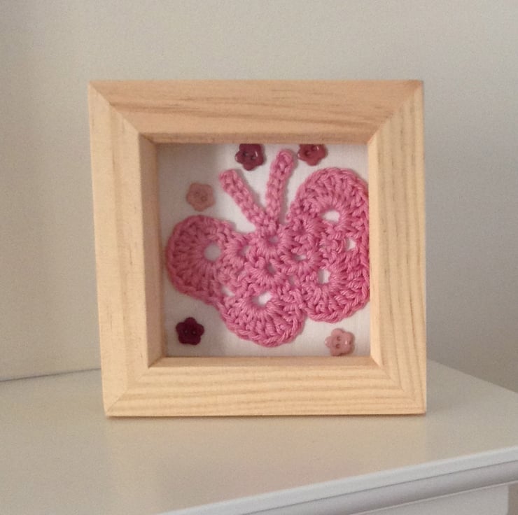 Crochet butterfly in pink, mounted in a small box frame, finished off with small pink flower buttons. There is a metal hanging loop on the back