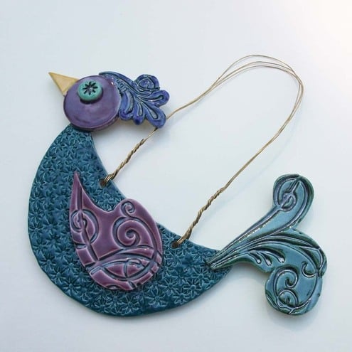 It is made from white earthenware clay, embossed with pattern and glazed in a variety of rich glossy glazes. It is hung on triple strand, antique gold wire.