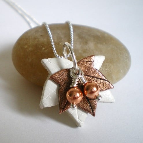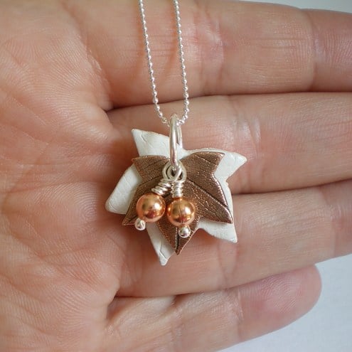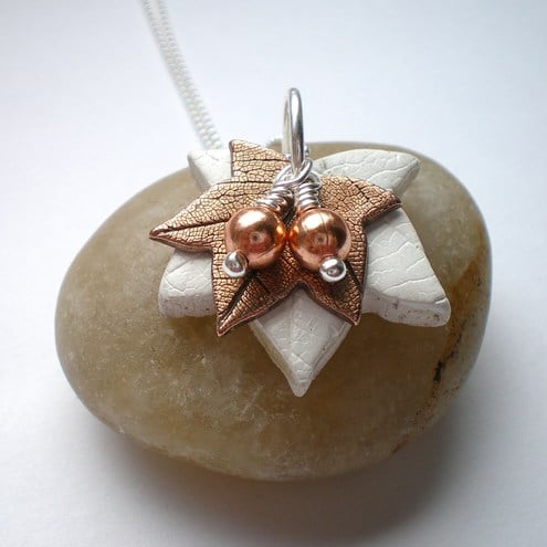 Pretty little summer pendant with handmade copper and ceramic leaves, finished with copper 'berries'.