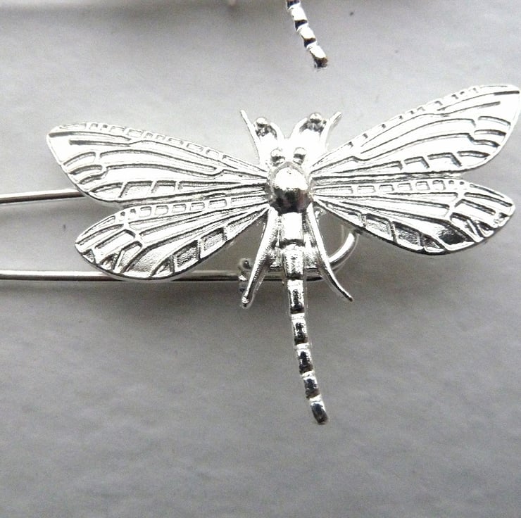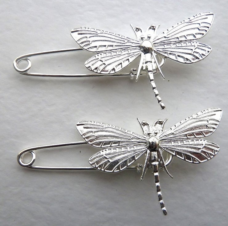 A pack of 2 silver plated brooch pins which have a dragonfly on.