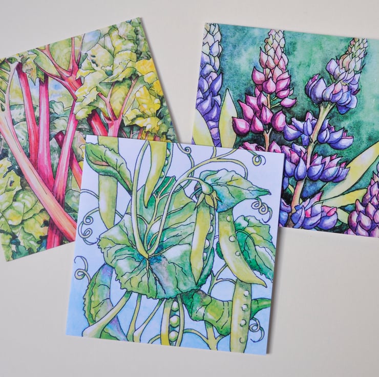 Pack of three beautiful greeting cards designed specially for gardeners. Printed professionally from original ink and watercolour paintings. Each card measures 148 mm x 148 mm (approx 6" x 6") and printed on 310 gms quality card each with a white envelope and cellophane wrapped. Left blank for your own personal message.