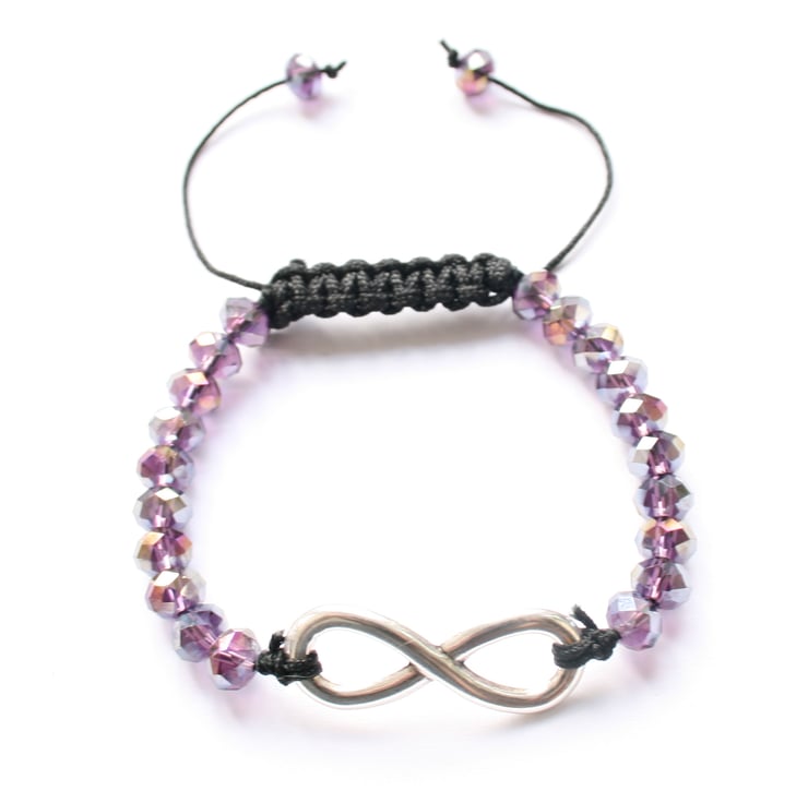 I have created this bracelet using 6mm purple Chinese crystal faceted rondelles and a gold plated infinity symbol which measures 12 x 30 mm. The bracelet is finished off using macrame knots to produce an adjustable fastening allowing the bracelet to comfortably fit any wrist.
