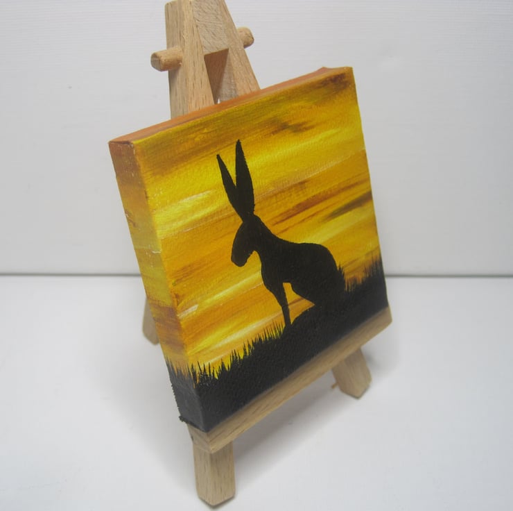 The picture is painted in acrylics, and features a hare silhouetted against a sunset sky.
