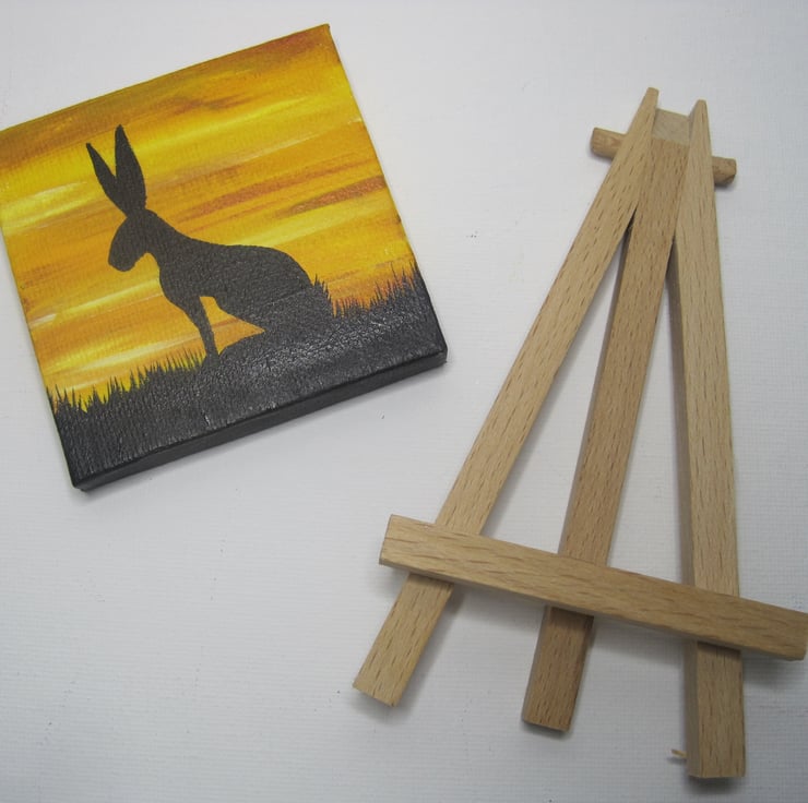 A miniature hare silhouette painting, on stretched canvas, complete with display easel.
