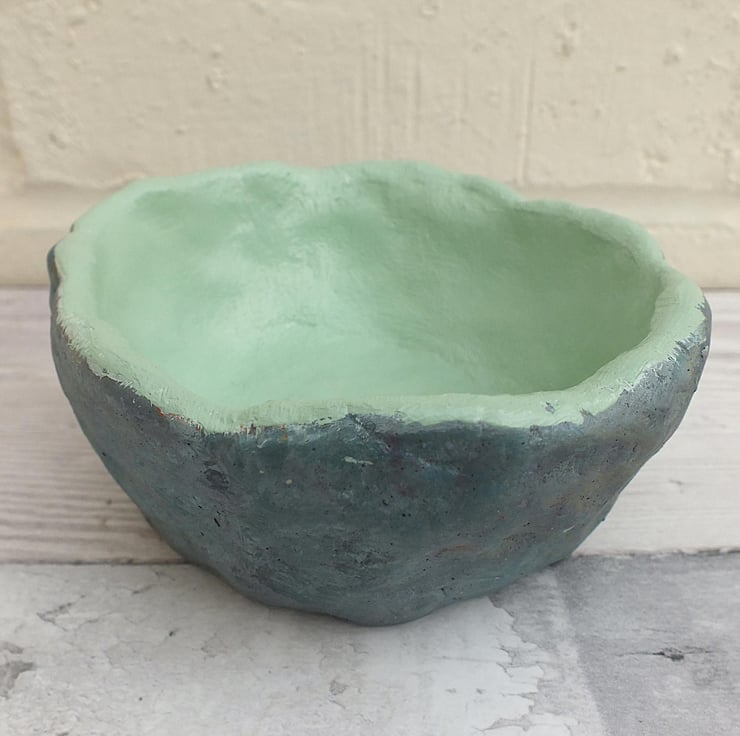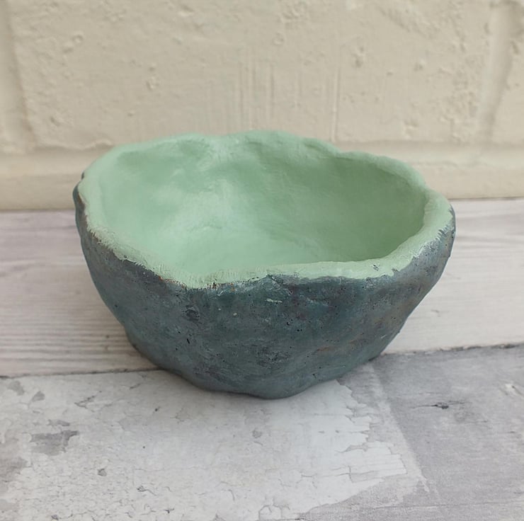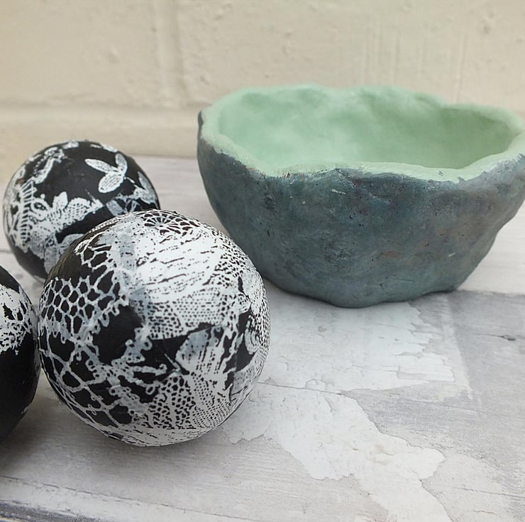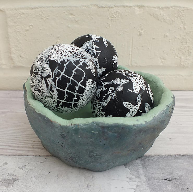 This simple but artistic pot has been hand-crafted from air-drying clay and painted in rich shades of acrylic. For a decorative touch I've papered three polystyrene balls in decopatch, which can sit in or around the pot. Although it has been varnished for protection it is intended really as an ornament rather that a functional container and should never be immersed in water. Measuring approx 10 cm across and 5 cm tall, this is a beautiful and unique ceramic.