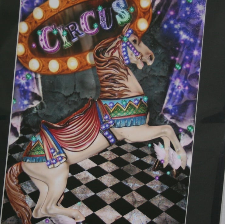 The backdrop of the circus ring has a floor in classic black and white and draping purple curtains.Above the horse, surrounded by bright lights is a sign spelling out CIRCUS.