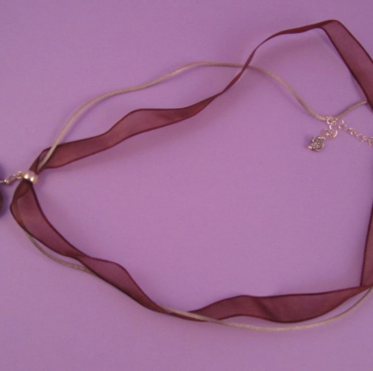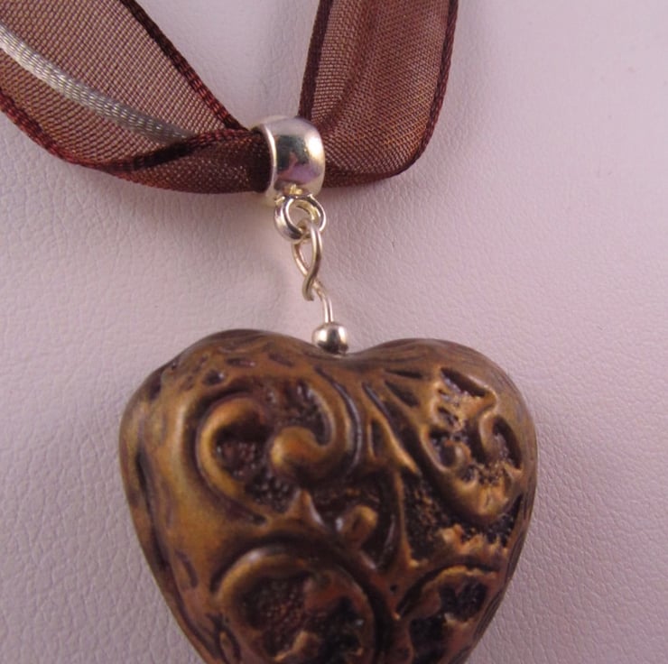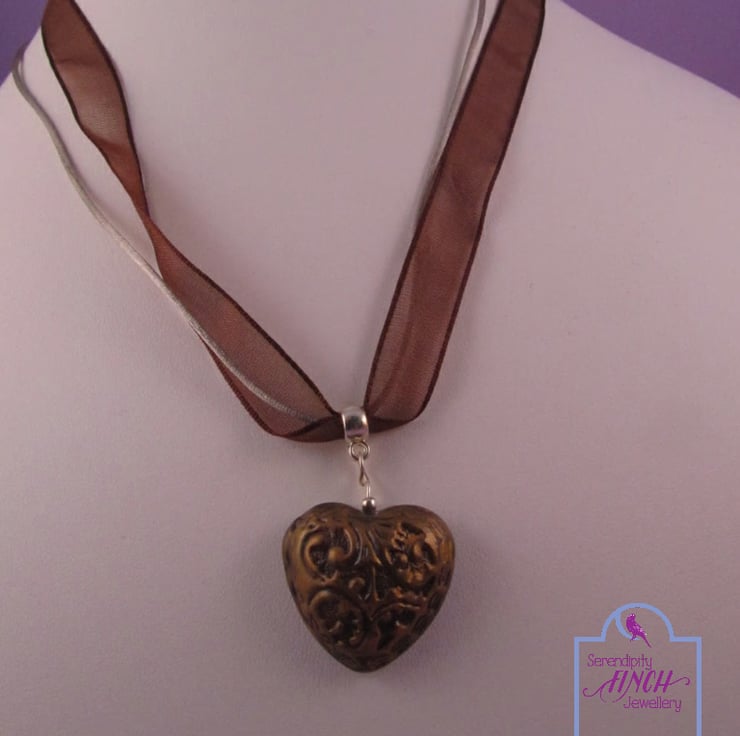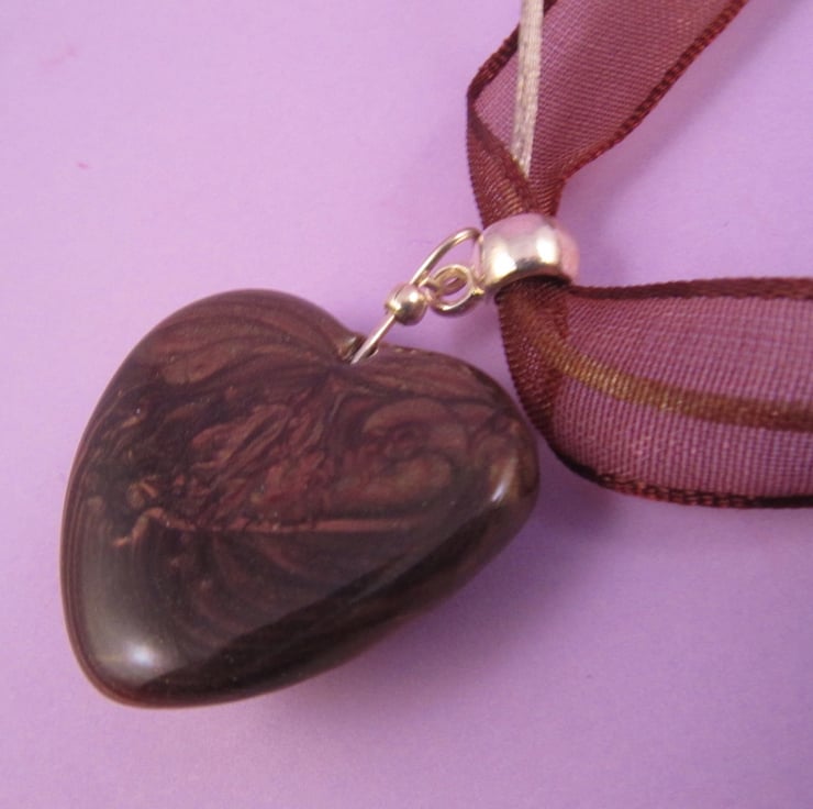 This is a beautiful red brown heart pendant brown ribbon necklace. It is created using brown and gold jewel enamel (UTEE), gold gilding wax, silver plated copper, satin cord and organza ribbon. It is a versatile piece of jewellery that can be worn either way round. It would look great with jeans.