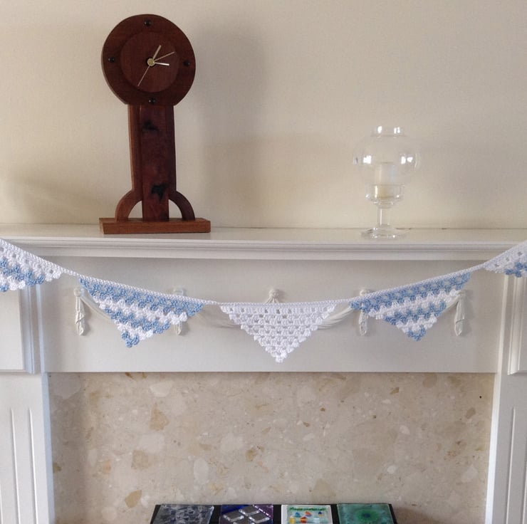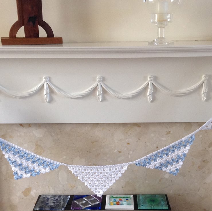 Triangular bunting in blue and white is a lovely decoration for a child's room.