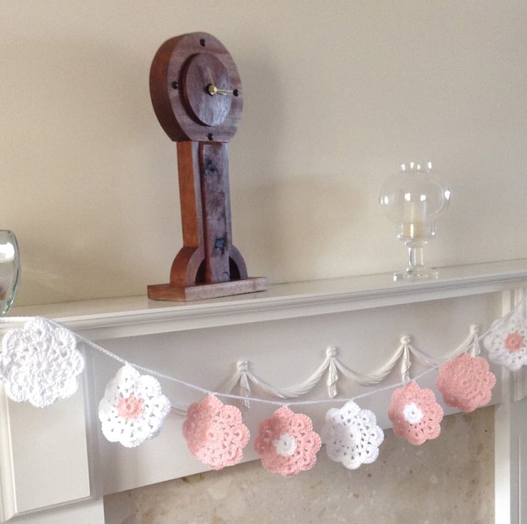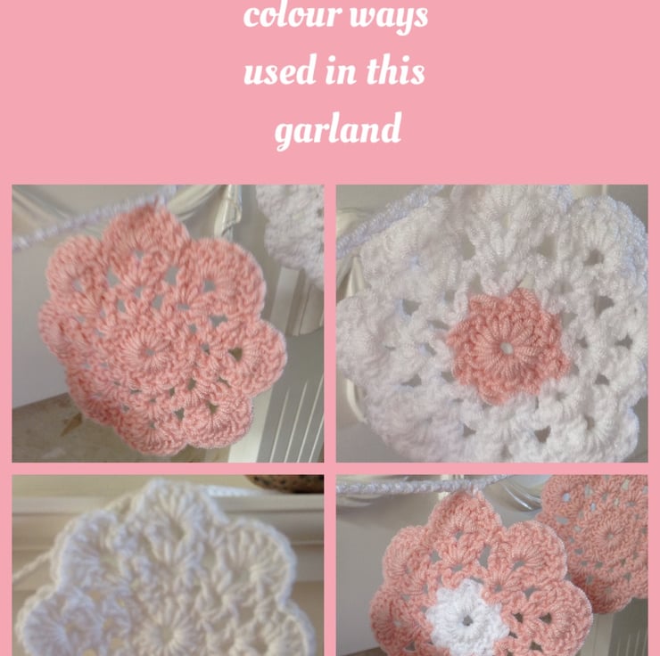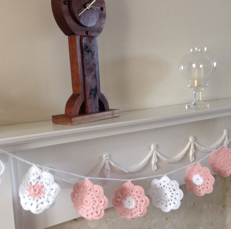 Pretty flower garland in white and pink. There are nine flowers in total in a variety of designs.