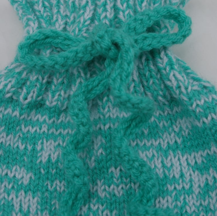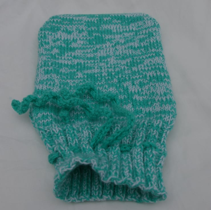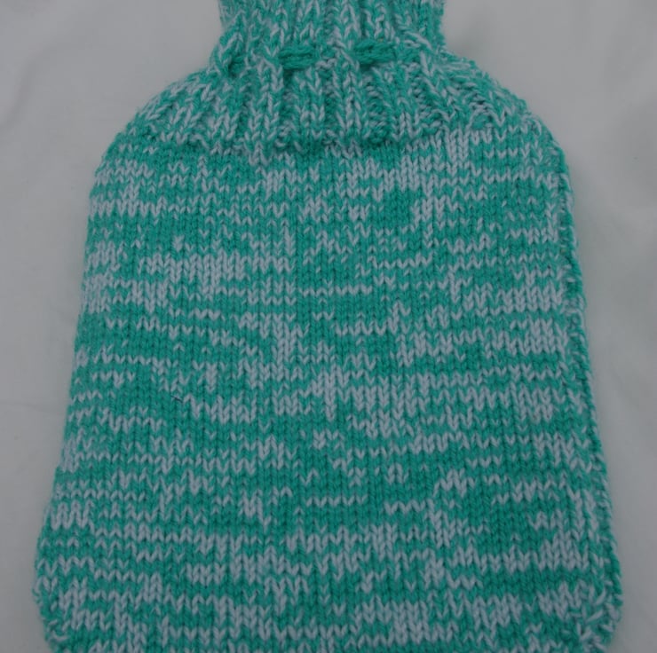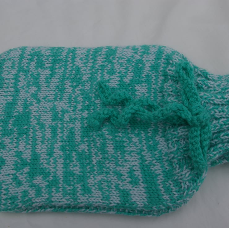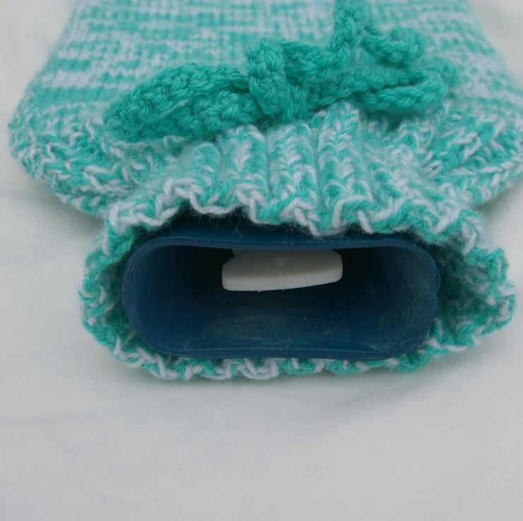 One Hot Water Bottle Cover, carefully hand knitted in Green and White yarn. The yarn used for this cover is 100% soft acrylic yarn, which is great for those who suffer with allergic reactions cause by animal based yarns. The case opens at the neck to receive a standard size hot water bottle. It fastens with a crochet mint green drawstring cord.