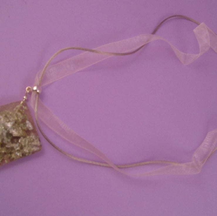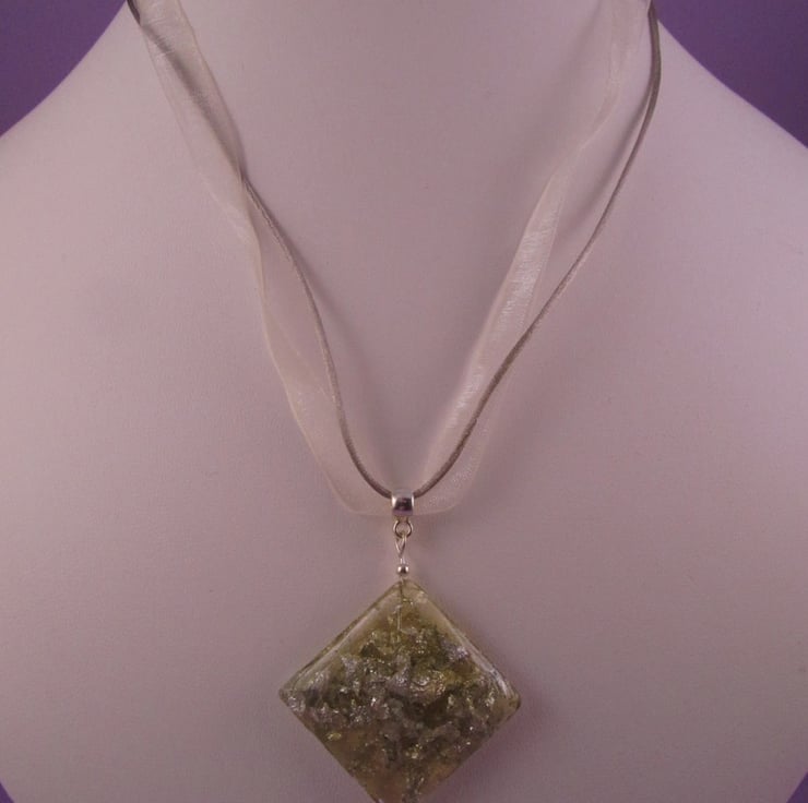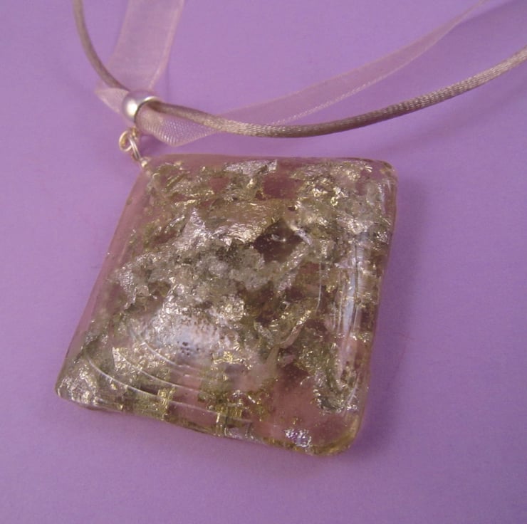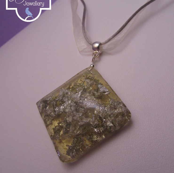 This is a beautiful silver gold square pendant with ribbon necklace. It is created using clear jewel enamel (UTEE), silver and gold coloured flakes, silver plated copper, satin cord and organza ribbon. It is a versatile piece of jewellery that can be worn either way round. It would look great with jeans.