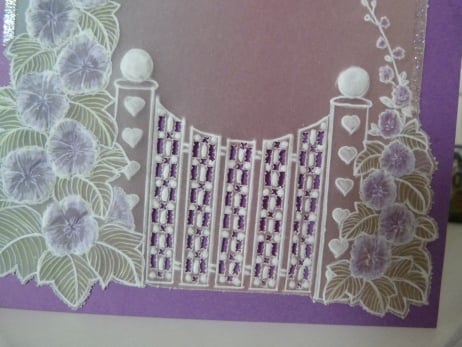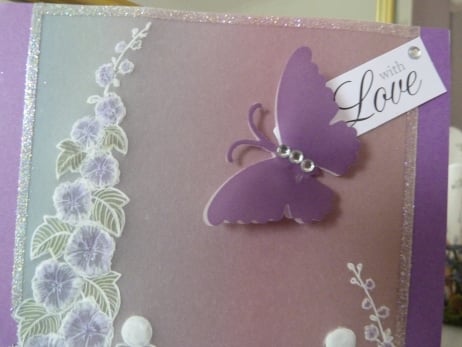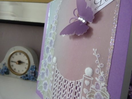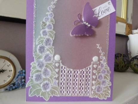 A beautiful design of a gate edged with hollyhocks embossed, pierced, cut and coloured onto rainbow shaded parchment. The hollyhocks coloured in pale lilac and pale green. The gate cut into an intricate design. Mounted onto purple card which has been mounted onto quality white card. Embellished with a double layered parchment butterfly finished off with three rhinestones for its body. The parchment edged with fine silver glitter. Further embellished with love tag.