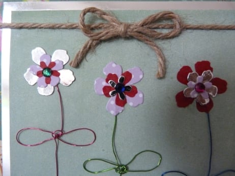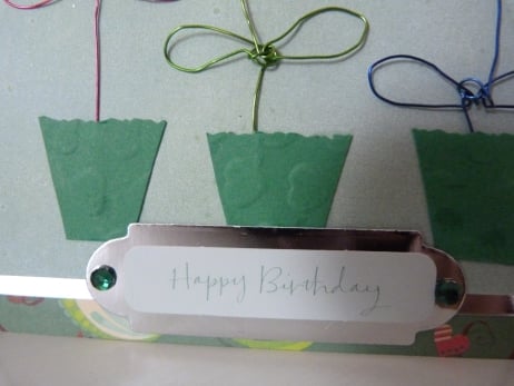 Three pots made from heart embossed green card. Filled with pretty flowers die cut from silver, red, and lilac spotted card. The stems handmade from red, green and blue wire with two leaves. Mounted onto pale green shaded paper then onto silver mirri card then onto green pattered paper and then onto quality white card. Finished off with twine and bow and happy birthday tag which is embellished with two green crystals.
