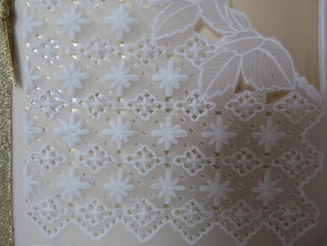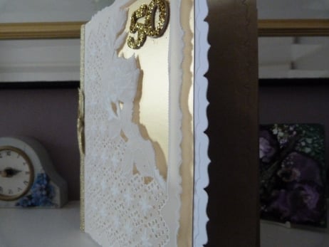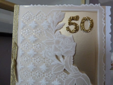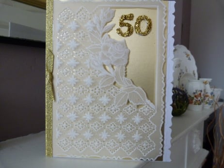 A beautiful design of a rose and intricate details embossed, cut and pierced from parchment. Mounted onto matt gold card and then onto quality white card. Gold glittered number 50 and finished off with gold ribbon and bow. The edges of the card cut with a pretty scalloped edging.