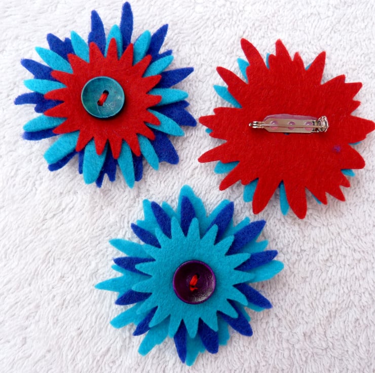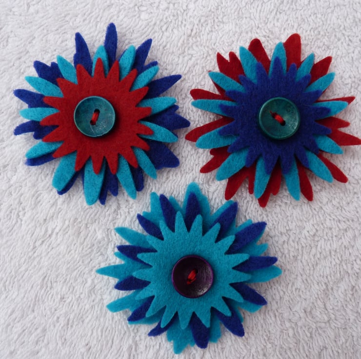These delightful felt corsages are made from bought and handmade felt. Each one is unique.