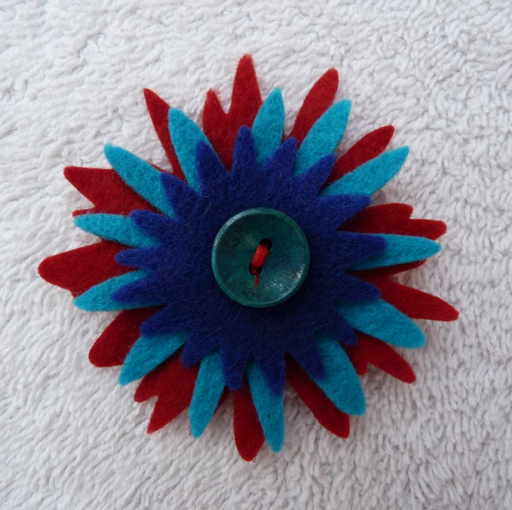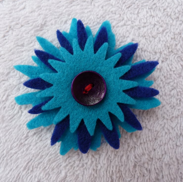 The petal shapes are held together with a wooden button, and a brooch pin with a safety clasp is glued onto the back.