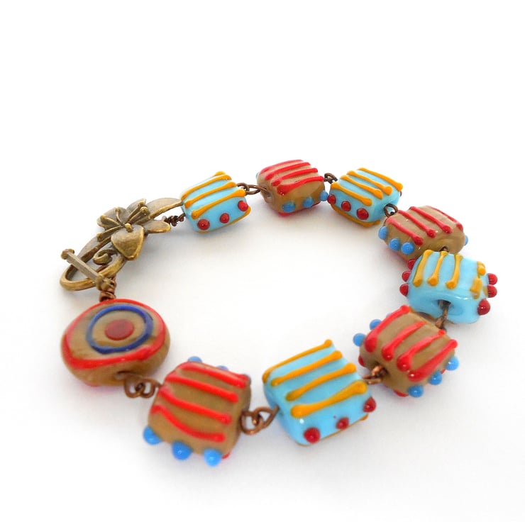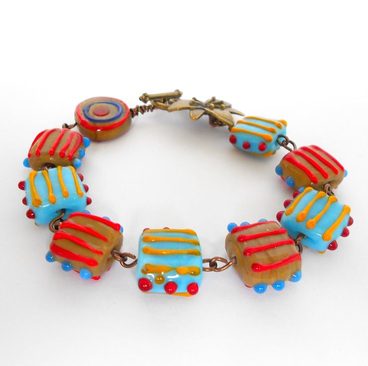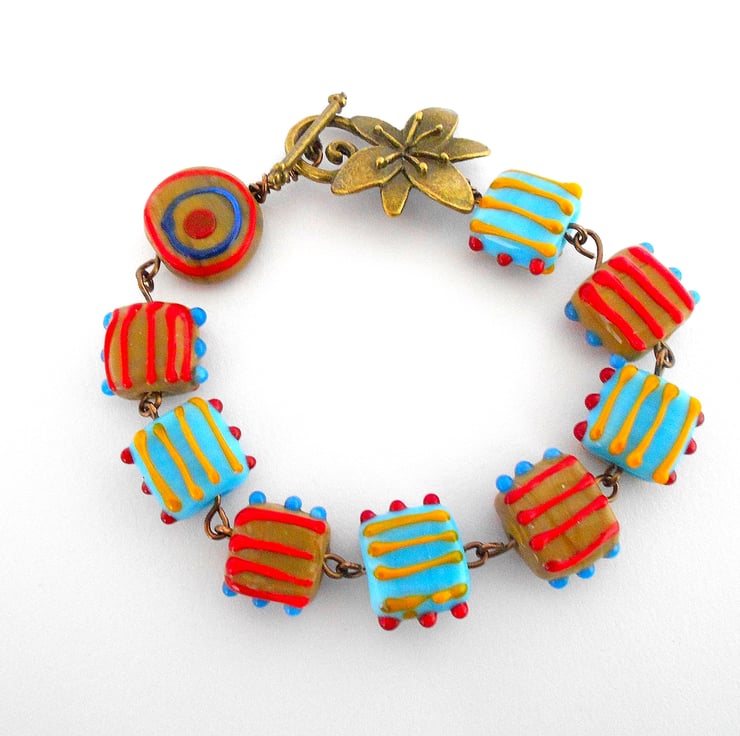This is a lovely bracelet made from square lampwork beads and one round. The beads are coloured caramel and turquoise with stripes of yellow orange and red. The bracelet measures 20cm (8") and is finished with a antique bronze flower clasp. As all of the items in my shop and individual pieces made by myself, this is the bracelet you will receive. It will arrive gift wrapped in tissue paper and a organza bag.
