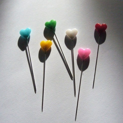Set of 30 delightful Heart Headed Pins...5 of each colour - red, white, turquoise,green, yellow and pink.... super size - from the bottom of the heart each pin measures 45mm