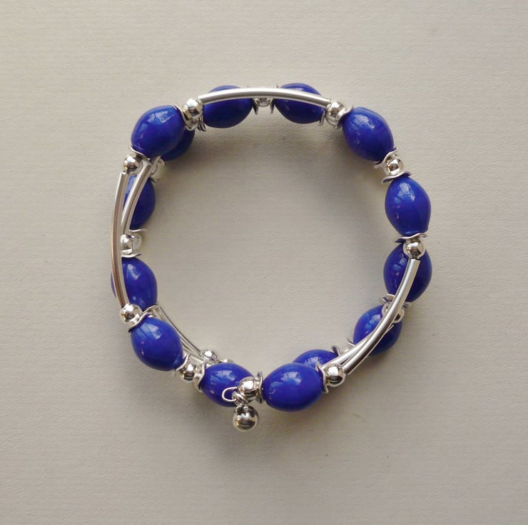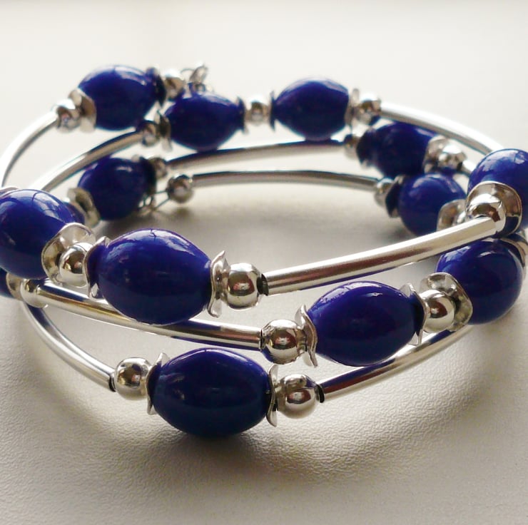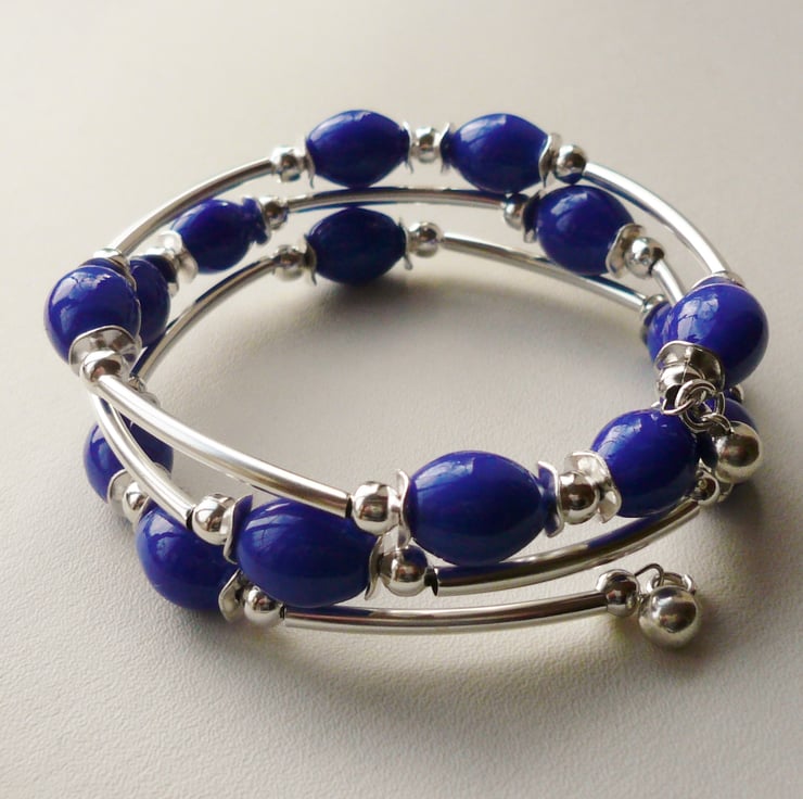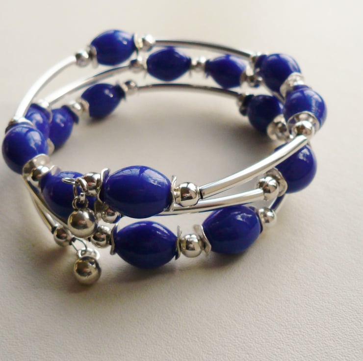 This bracelet is made up of 15mm long blue oval glazed ceramic beads separated by silver plated wavy disc, round and tube spacers. These have all been threaded onto three coils of silver plated memory wire and finished off with silver plated round bead charms at both ends.