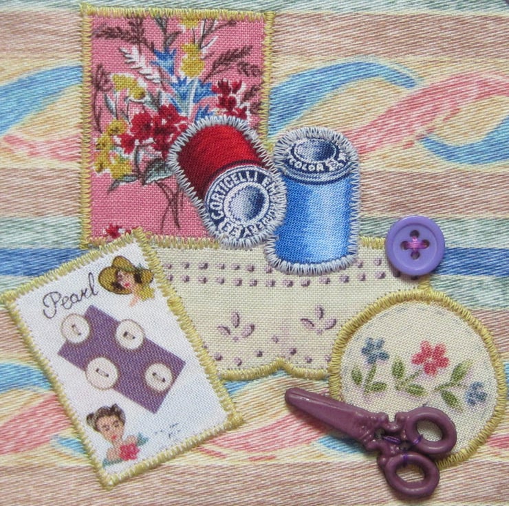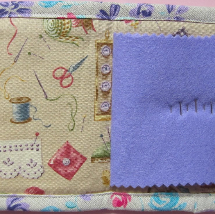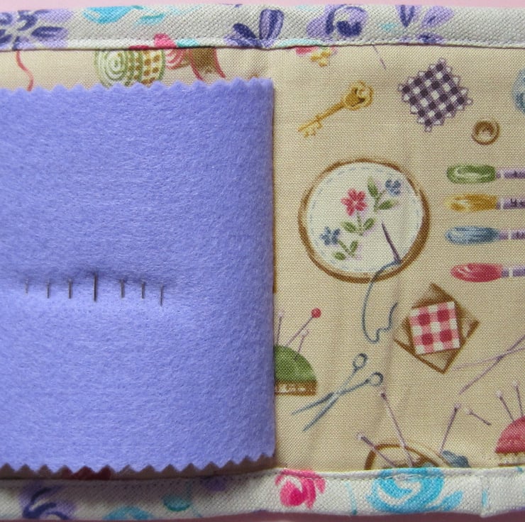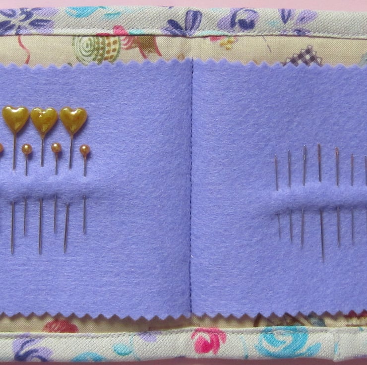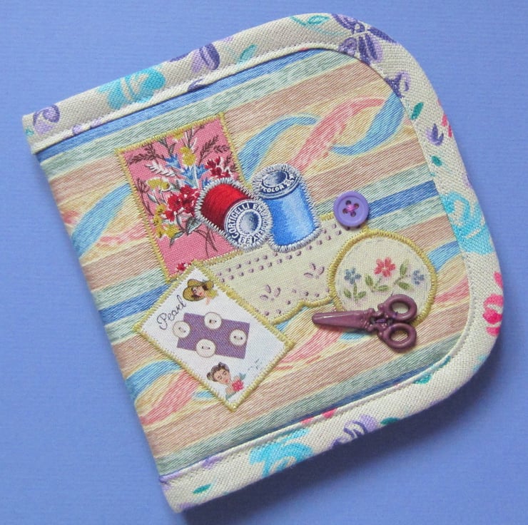 Lightly padded needle case appliqued with sewing items and decorated with a pair of scissors button and another button. Inside there is a lilac felt page complete with pins and needles. Measures 13.5 cm x 12.5 cm when closed (13.5 cm x 25 cm when open).