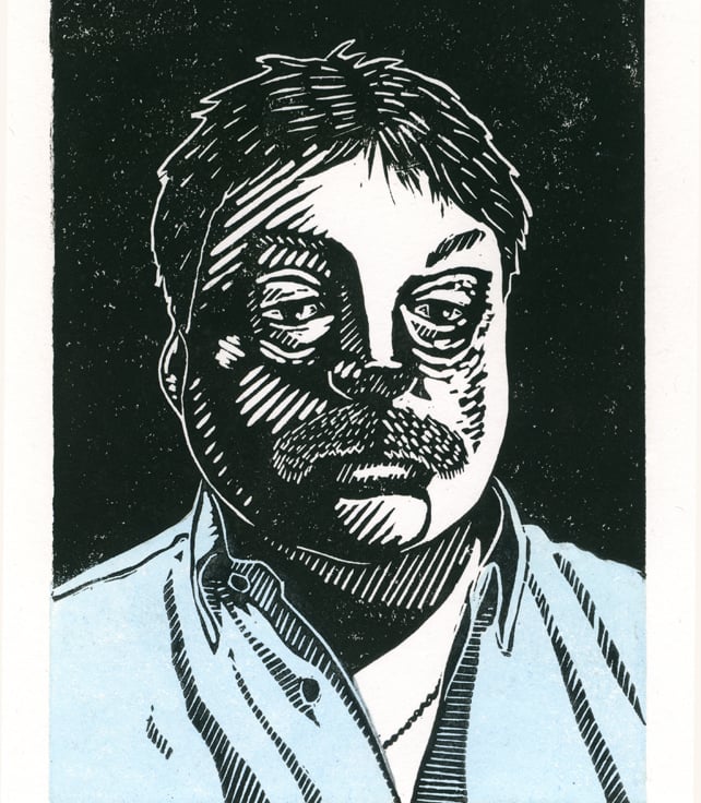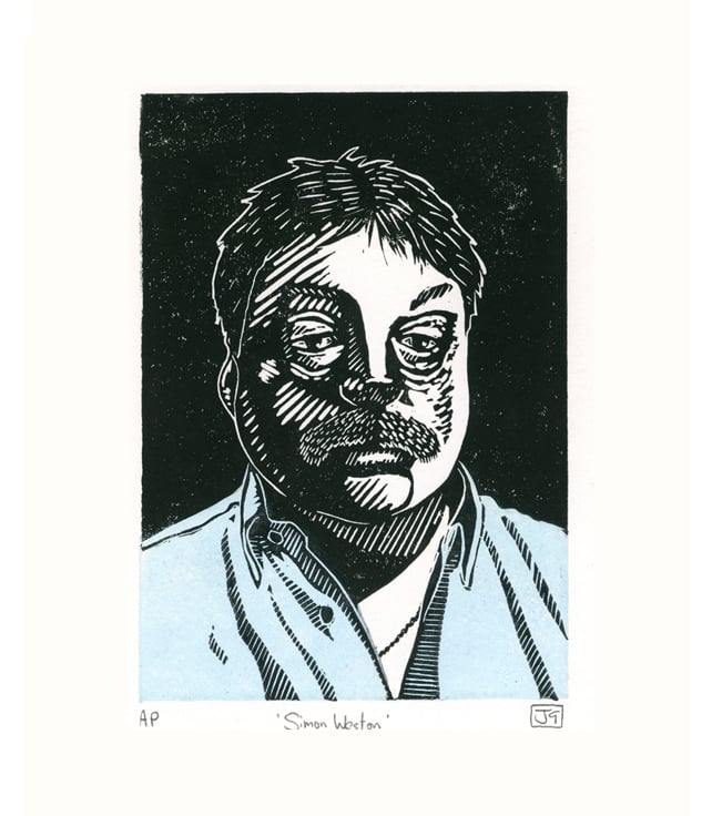 A 2-colour hand-pressed linocut portrait print of the charity campaigner and war veteran Simon Weston OBE.