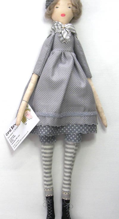 Milly is a cloth doll made with a tea dyed calico body and a hand embroidered face. She is made to my own pattern. She has hand stitched and styled wool tops for hair in a soft fawn colour. She sports a very neat grey crochet hat. Her dress is a tiny cotton spot print in grey and she has co-ordinating underskirt & knickers. She stands 50cm tall and has a tiny waist with a plump bottom and she has button joints for her arms. She will sit nicely on a chair or a bed.