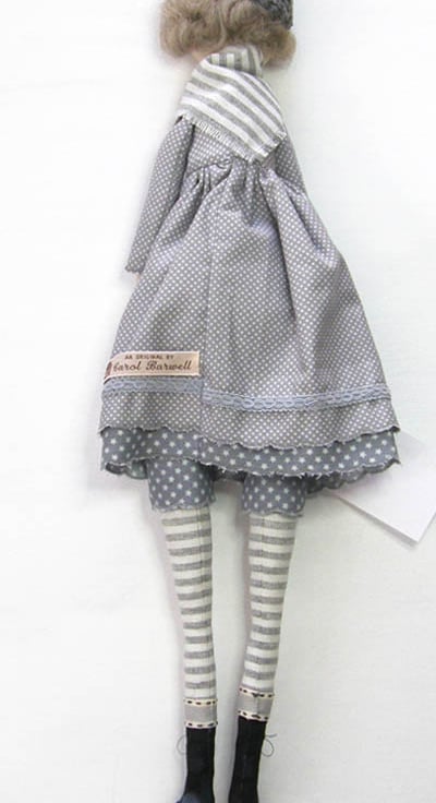 I wanted to make a slimmer profile doll with different styling to my older doll patterns. The best way was to change her face. It took quite a lot of time to get the eyes right and I settled on using french knots and a little pert felt mouth. I like her look and I hope you do too.