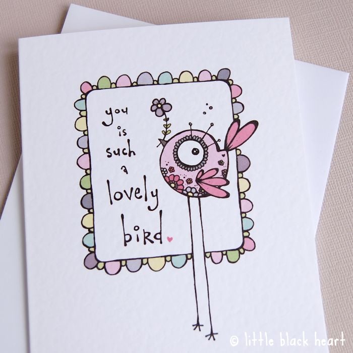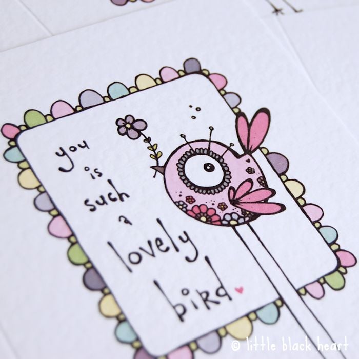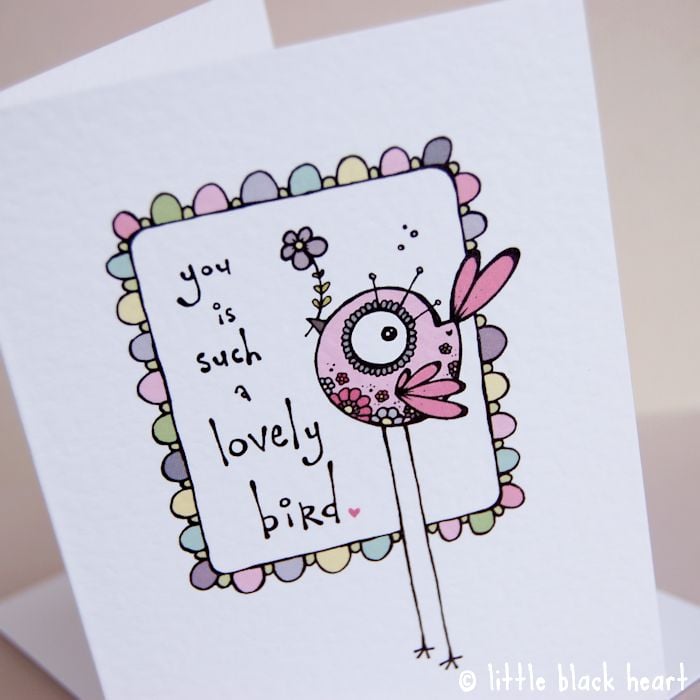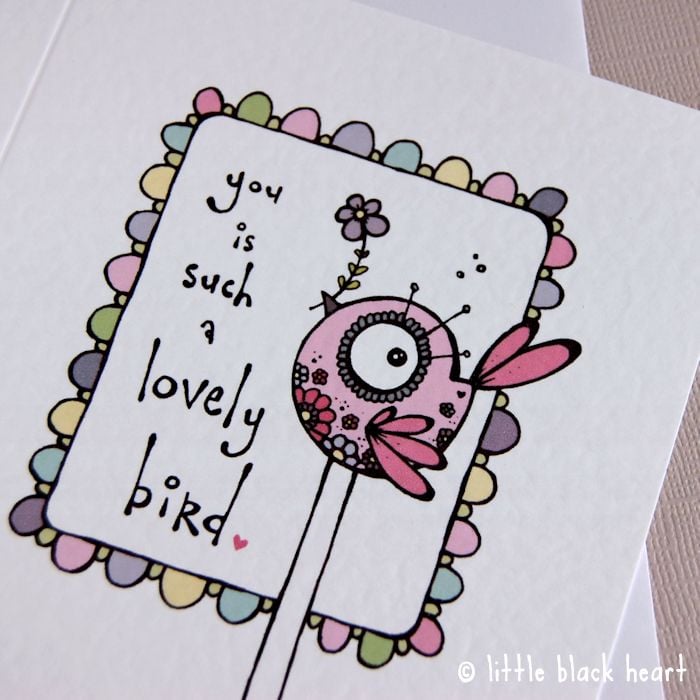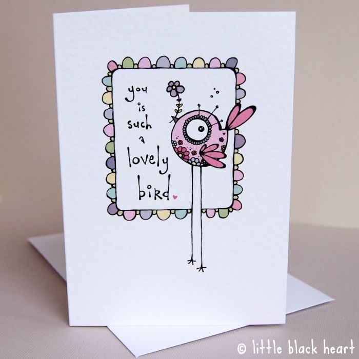 one of my original hand drawn designs, it is scanned in and coloured digitally before being printed onto a lovely quality textured white matte card (300gsm).