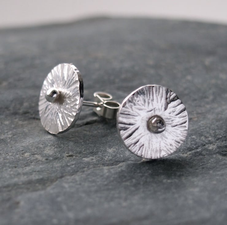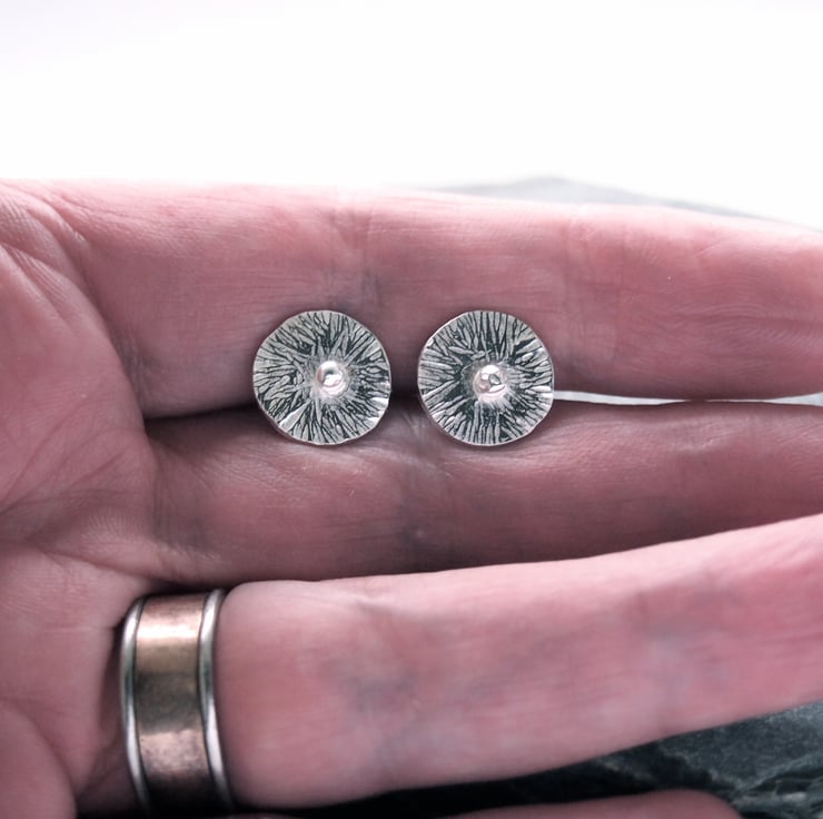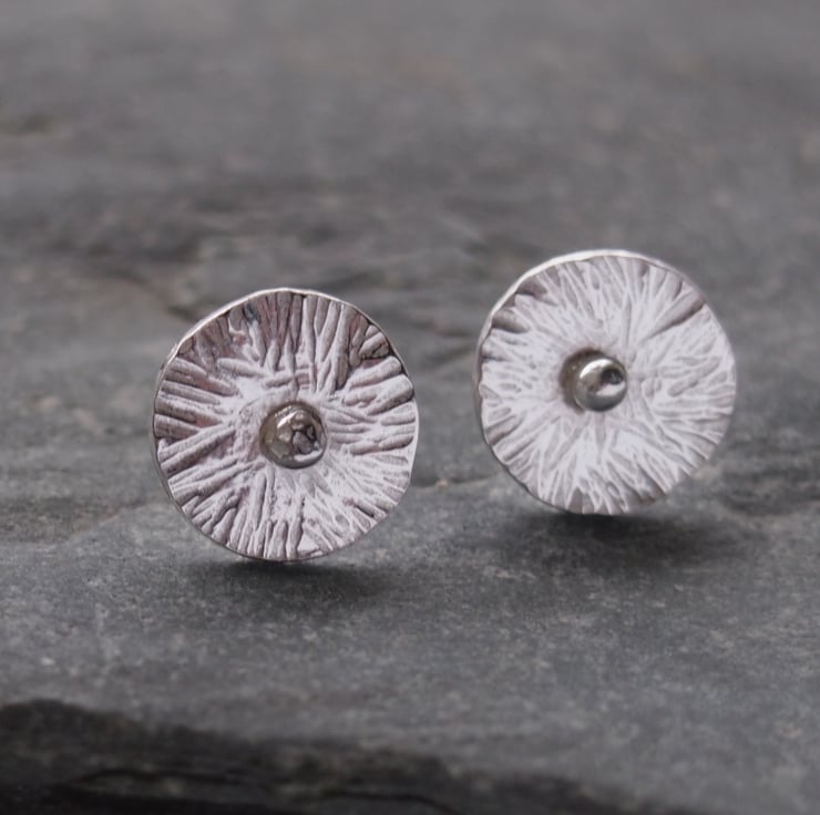 I've used the same bark like texture as I've used on other earrings and on the Bark rings but this time in a circle - and then added a silver dot.