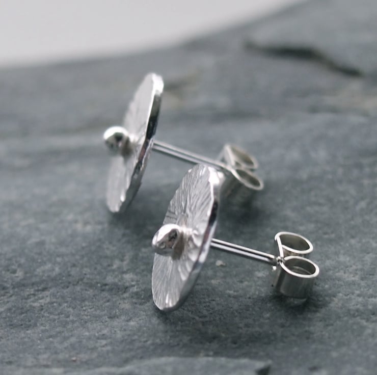 Textured sterling silver discs are soldered to a post with a scroll back. The discs measure just over 1cm.