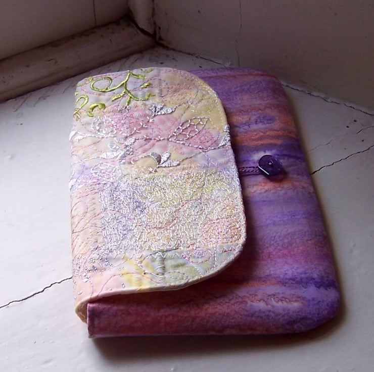 This bag is made using a one-off fabric for the flap, made from complimentary fabrics pieced together with machine embroidery and fabric paint.. I made these fabrics myself. Each bag made using this method is therefore absolutely unique.