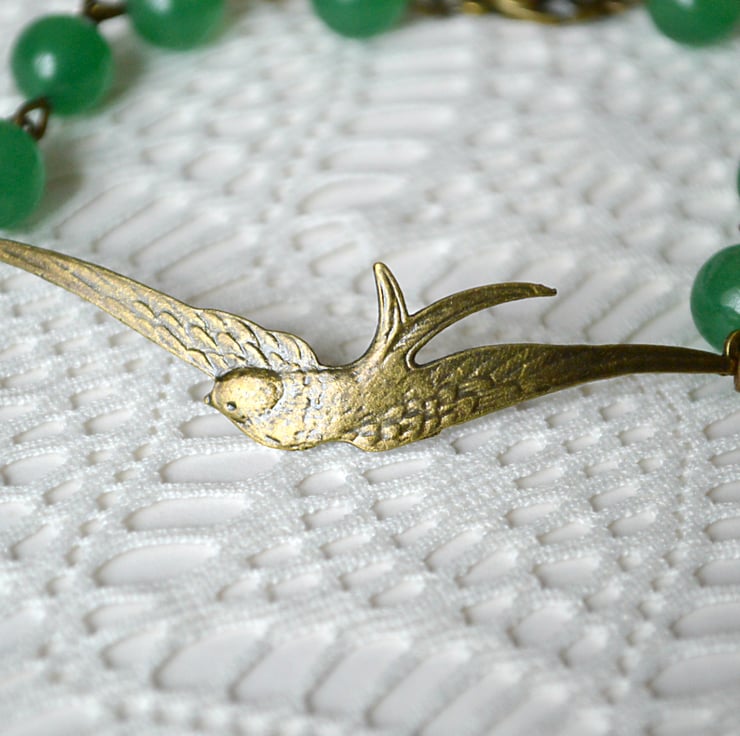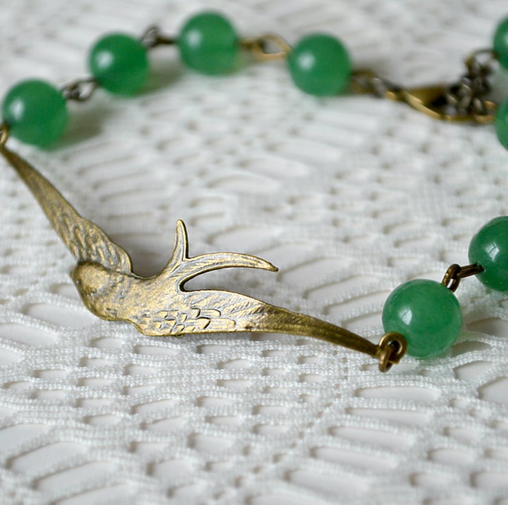 A pretty, beaded bracelet with green Jade and a bronze, soaring bird detail.