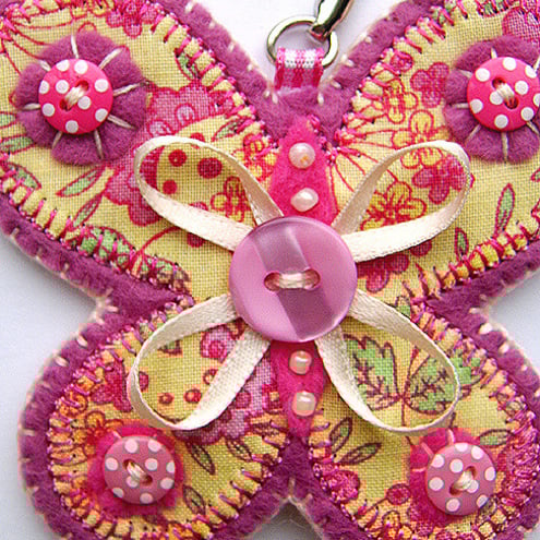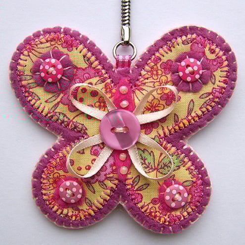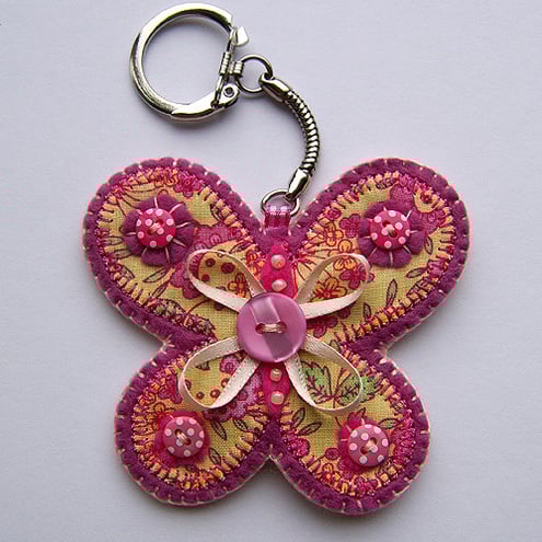 The butterfly is in pretty cotton print fabric which is appliqued onto a felt base, it has a beaded body and polka dot button spots and is finished with a lovely ribbon detail. It is backed with felt and has a metal key ring attached.