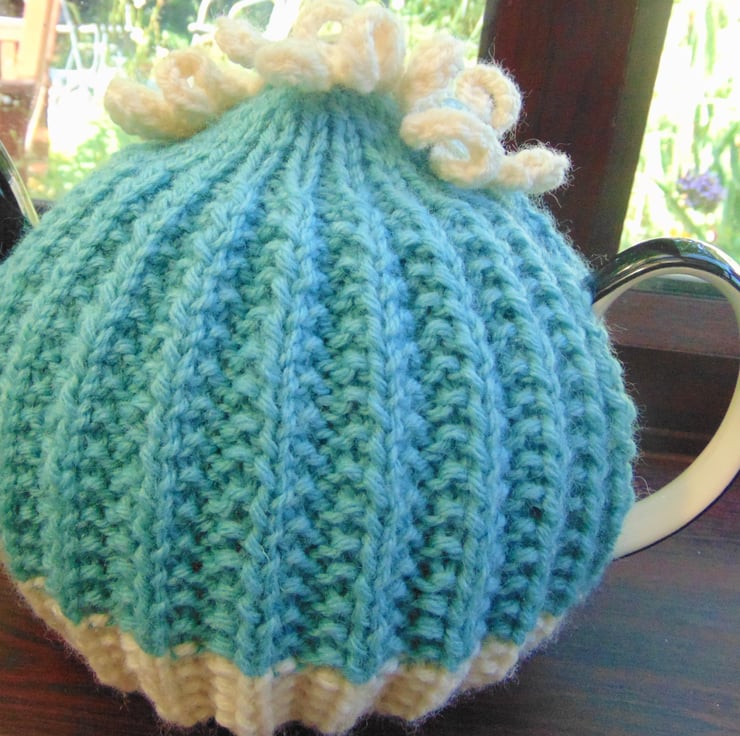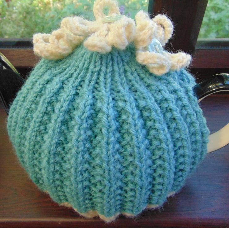 Hand knitted Tea Cosy in thick succulent and cream coloured yarn. Embellished with cream knitted flowers and polka dot buttons