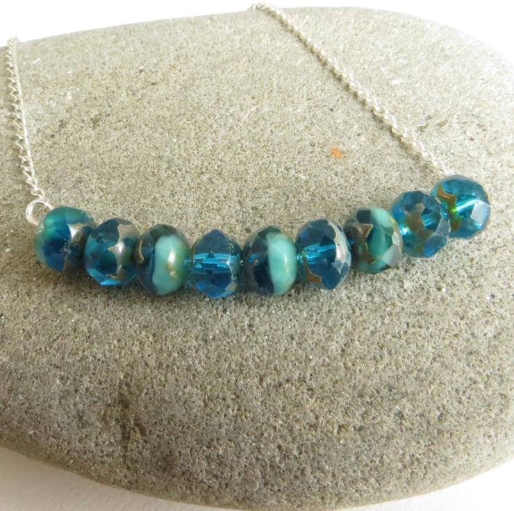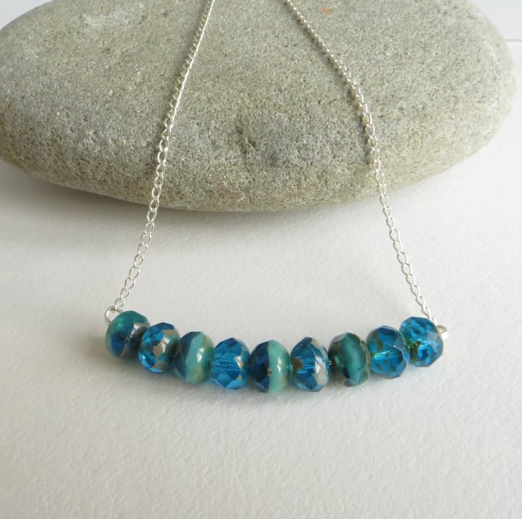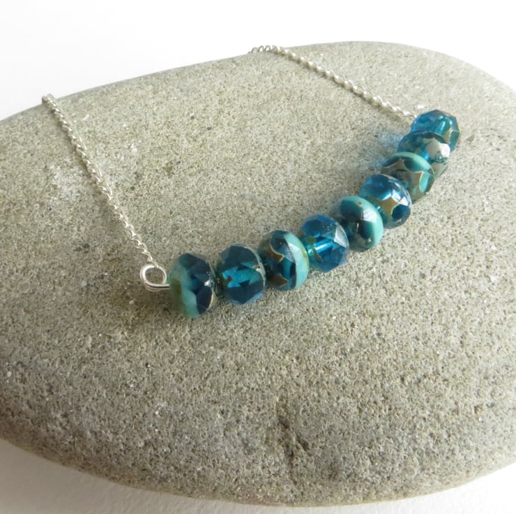 It features beautiful faceted turquoise czech glass beads which have been wired into a bar pendant shape and hung from a fine silver plated chain. A simple design yet the beads are so lovely they really speak for themselves!