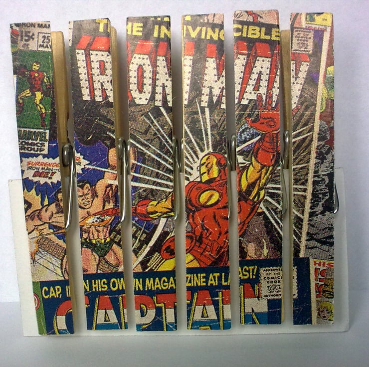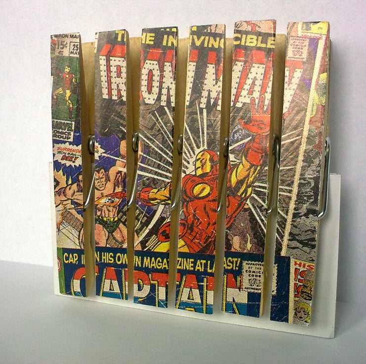 A set of 6 decoupaged pegs made into magnets featuring Iron Man paper. Exact pattern placement may vary slightly between sets. Great gift for the hard to buy for man, or just for organising your fridge with flair!