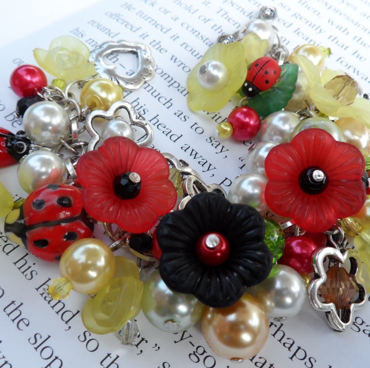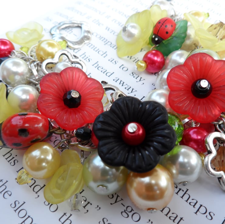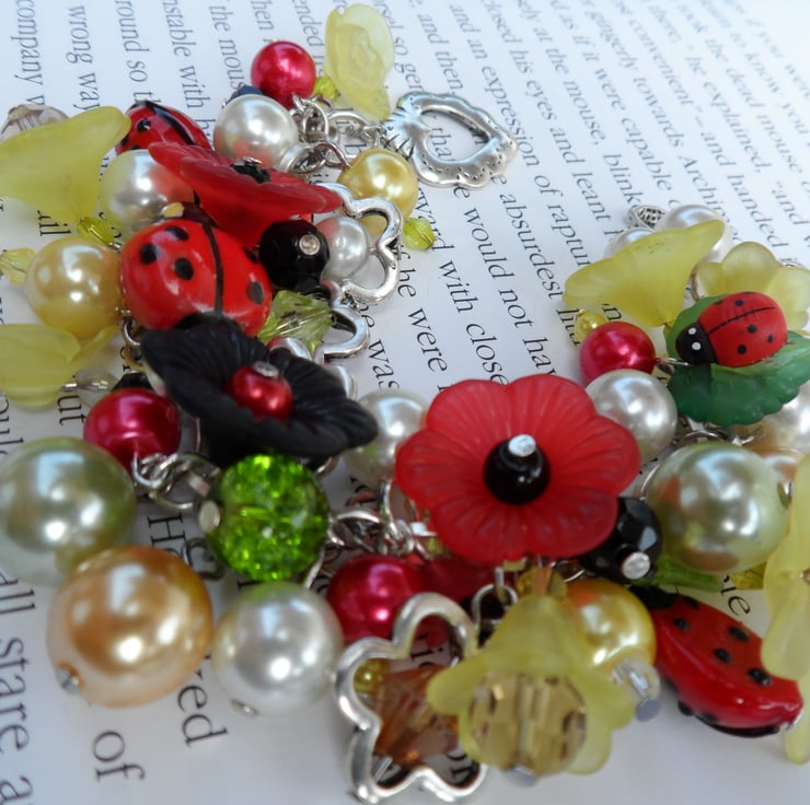 A beautiful beaded Ladybird theme bracelet packed with a variety of sized Red and yellow, Green and Black glass pearls and lucite flowers, leafs,crystals and porcelain ladybirds with silver flowers all attached on a strong silver chain with a easy heart toggle fastener measures 7.5 inch which can be adjusted to suit.