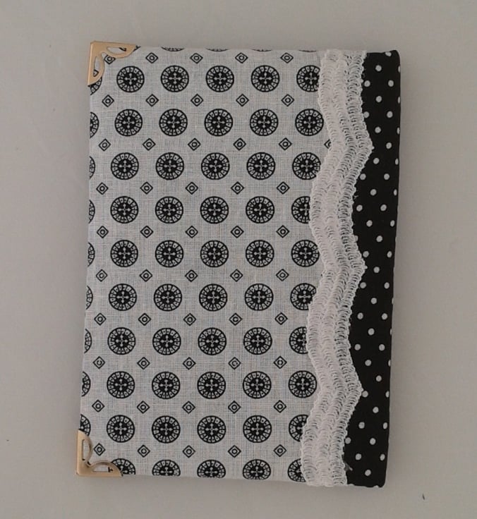 A lovely little notebook with 120 lined pages. This notebook has a padded cover which is hand covered with two colour coordinated black and white fabrics in contrasting designs.