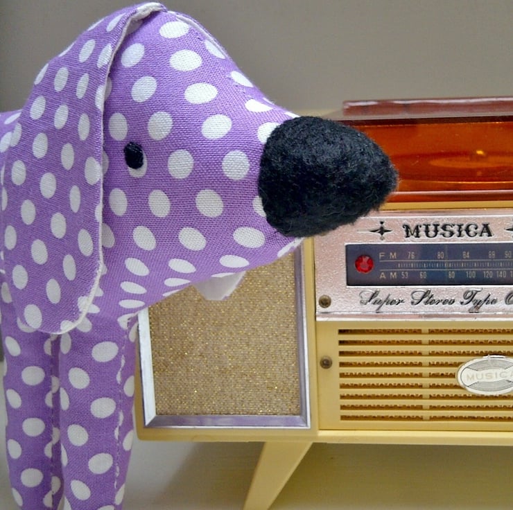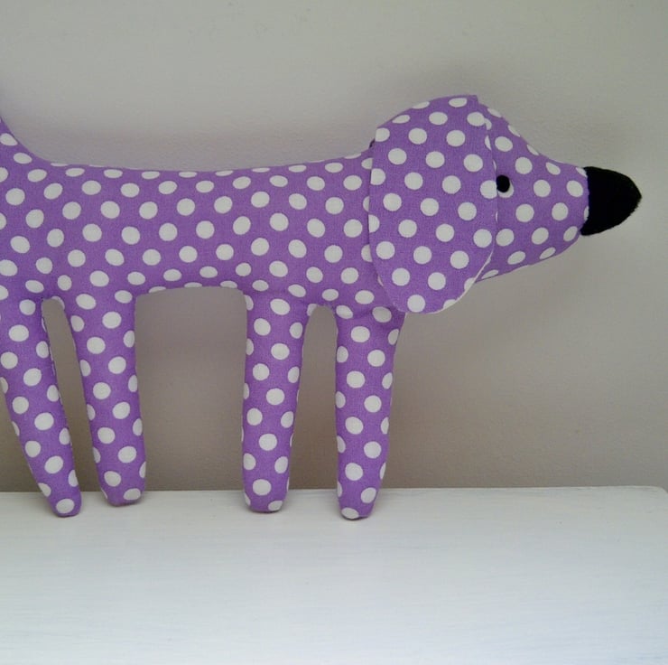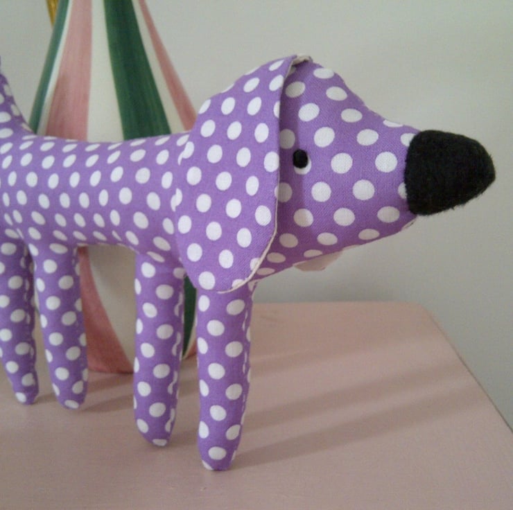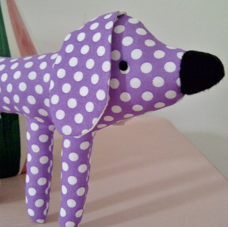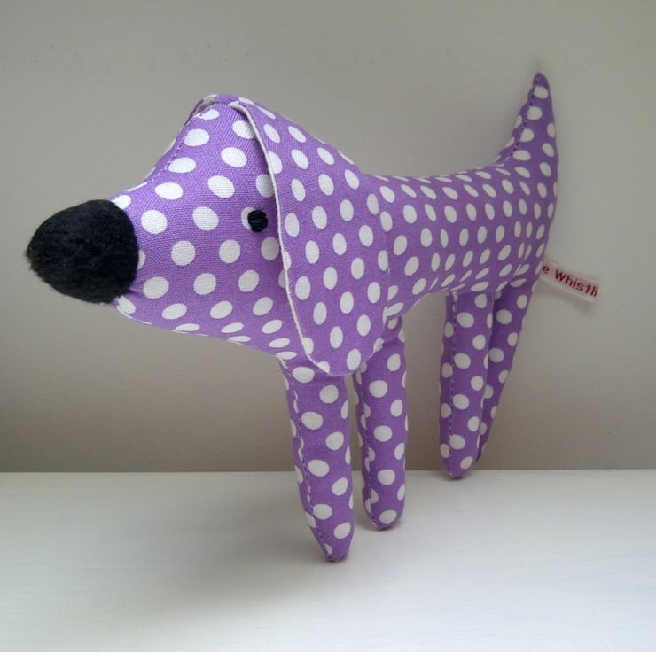 This lovely little spotty pup is just the perfect size to tuck into a pocket and for holding in the hand to play. He's made using a lovely light purple and white spot cotton fabric.