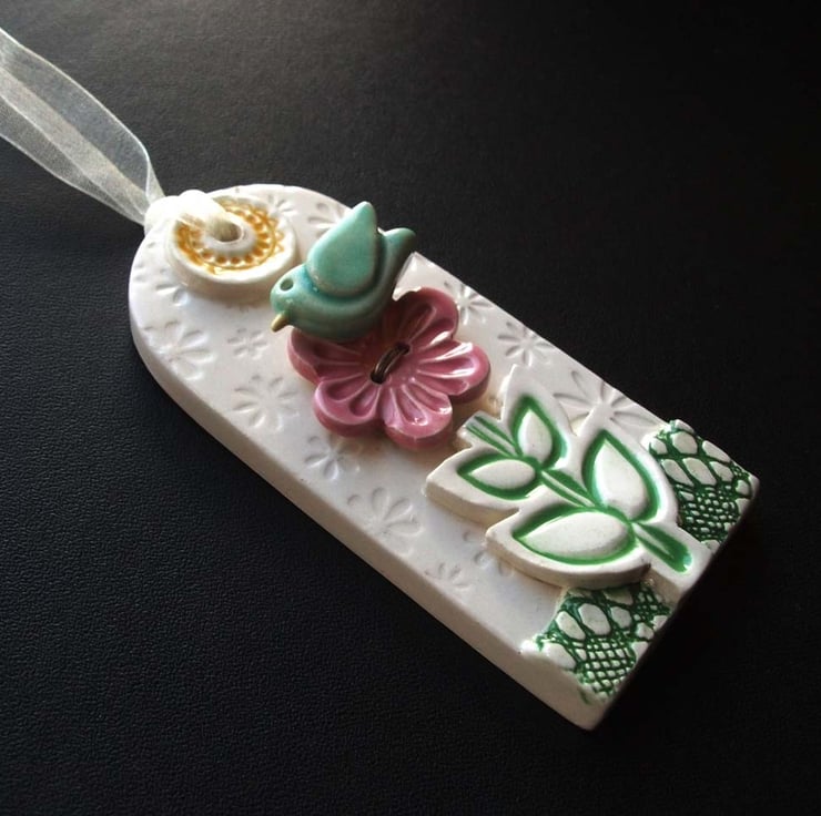 This tag style hanging decoration is made from white earthenware clay.