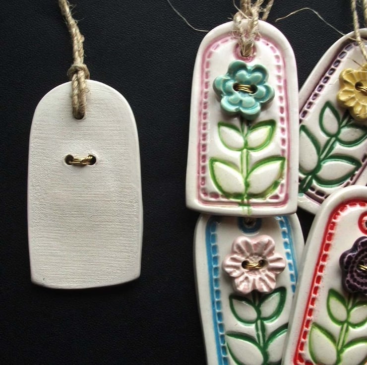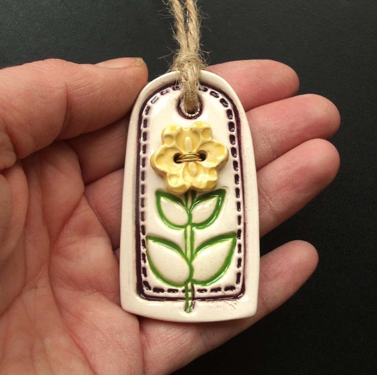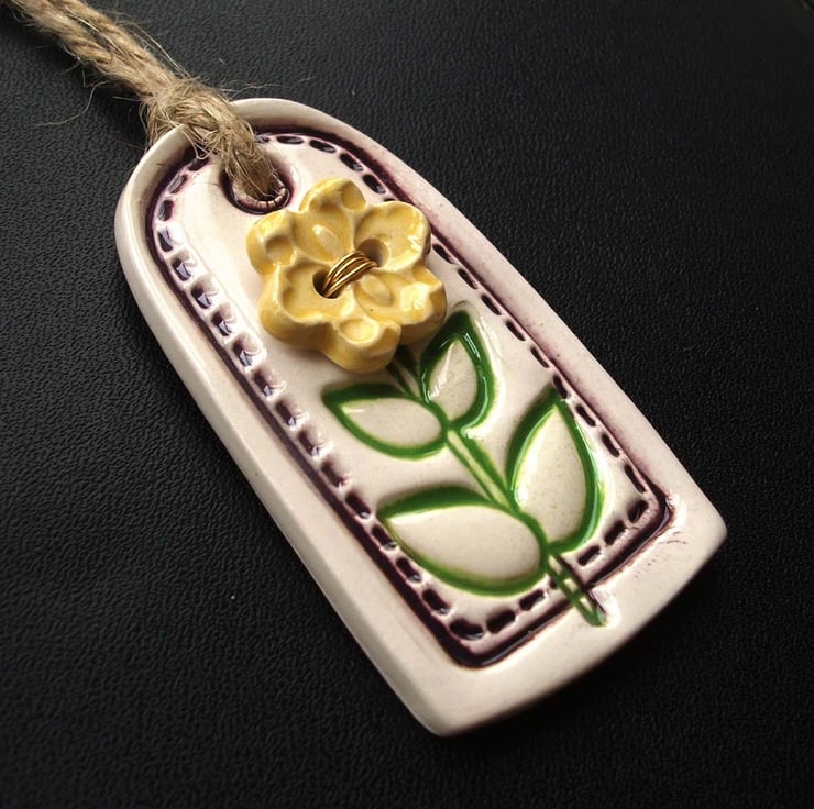 This cute little flower tag decoration is made from white earthenware clay and imprinted with a leafy design. A handmade ceramic flower button has been added to the front with gold coloured wired.
